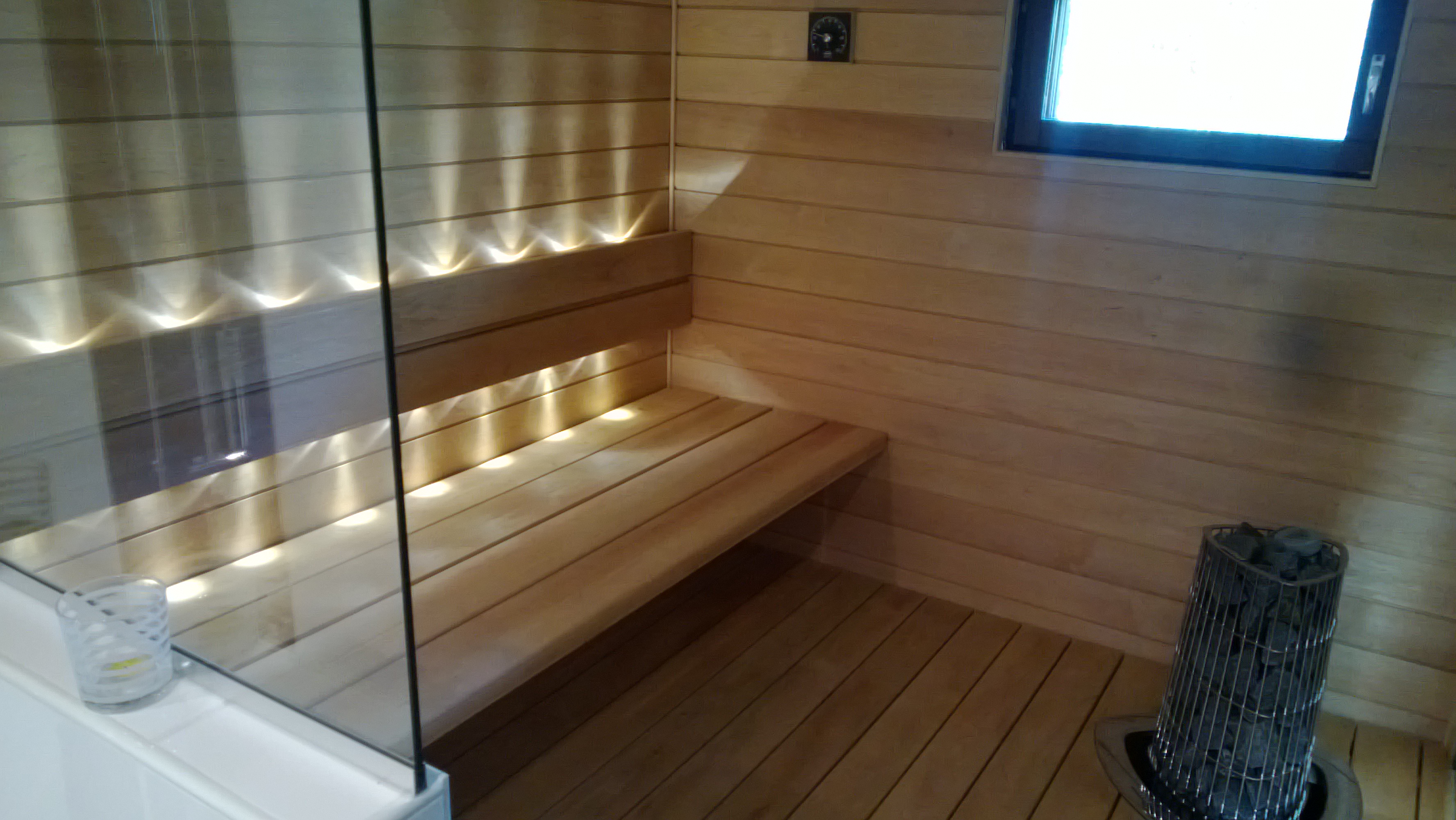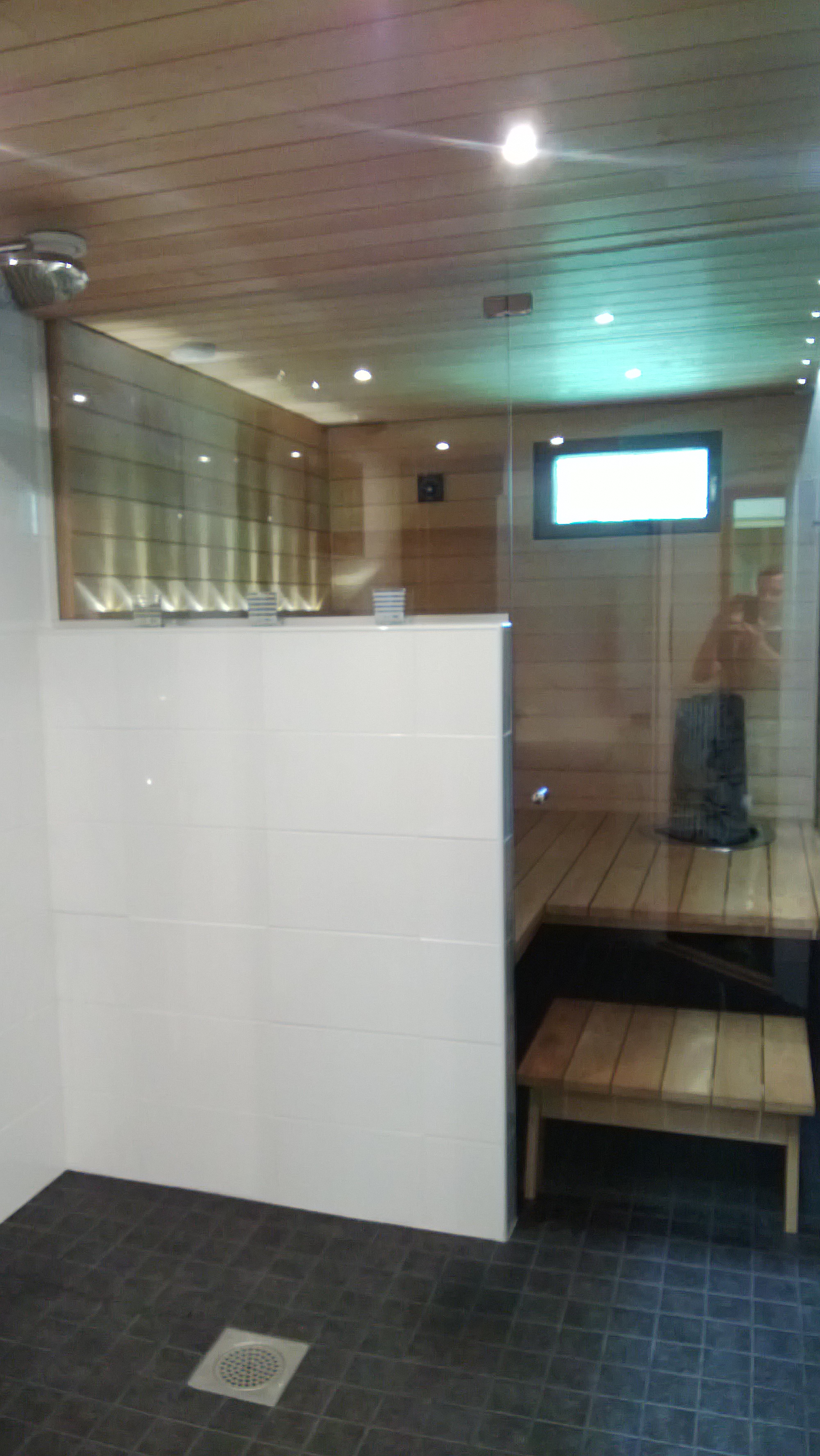 Saunasta tuli huomattavasti avarampi ja valoisampi osittaisen lasiseinän ansiosta. Suihkuttelevia lapsiakin on helpompi valvoa suoraan lauteilta.